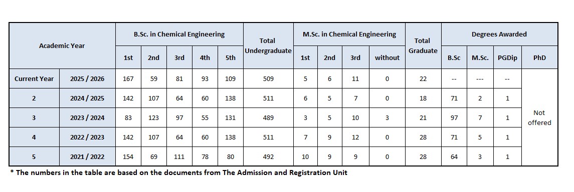 The following table presents the number of enrolled students and graduates for each academic program in the Department of Chemical Engineering, categorized by academic year and study level (Bachelor's, Master's, and Higher Diploma). The table allows tracking the development of student numbers over the past academic years and provides insight into the size of each program and its graduates.