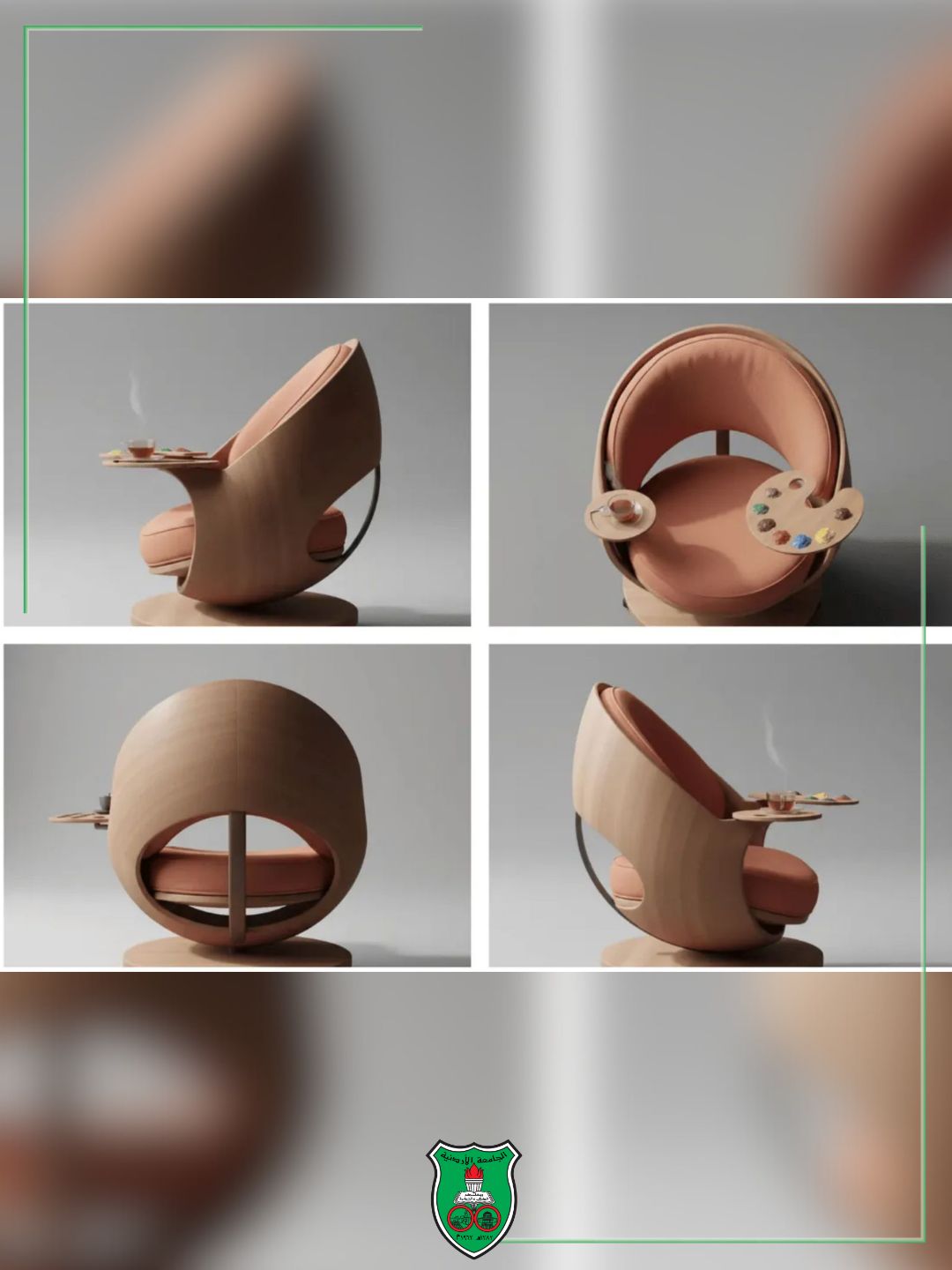 ويتجسّد الكرسي في غلاف خشبي نحتي يحتضن الجسد بحركة دائرية متواصلة، في دلالة رمزية على الحماية والاستمرارية والتأمل الداخلي، فيما تعزّز الألوان الدافئة والخطوط الانسيابية الإحساس بالاحتواء، بما يخلق مساحة إبداعية داخل الفضاءات السكنية تصلح للرسم أو القراءة أو التأمل الهادئ.